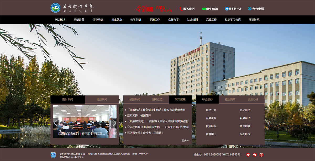 通遼職業(yè)學(xué)院是一所公辦全日制綜合性普通高等院校,以舉辦高等職業(yè)教育為主,兼?zhèn)渲械嚷殬I(yè)教育、電大開(kāi)放教育和社會(huì)培訓(xùn)職能。學(xué)院成立于 2004 年,由原哲盟師范學(xué)校、哲盟衛(wèi)生學(xué)校、哲盟教育學(xué)院、內(nèi)蒙古電大通遼分校合并組建而成,辦學(xué)歷史始于 1951 年。2009 年通過(guò)教育部高職高專(zhuān)人才培養(yǎng)工作評(píng)估,現(xiàn)為內(nèi)蒙古自治區(qū)示范性高等職業(yè)院校、自治區(qū)園林式單位、自治區(qū)文明校園,是中國(guó)教育發(fā)展戰(zhàn)略學(xué)會(huì)產(chǎn)教融合專(zhuān)業(yè)委員會(huì)常務(wù)理事單位、全國(guó)高職高專(zhuān)校長(zhǎng)聯(lián)席會(huì)成員單位。